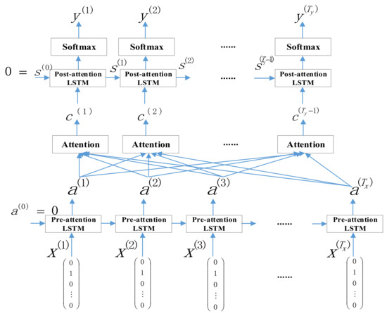 (1) Definitions of the two LSTM models in Figure 2. The LSTM model before the attention mechanism is defined as pre-attention LSTM in this paper. The LSTM model behind the attention mechanism is defined in this paper as post-attention LSTM. Pre-attention LSTM is over Tx time steps, while post-attention LSTM is over Ty time steps.
