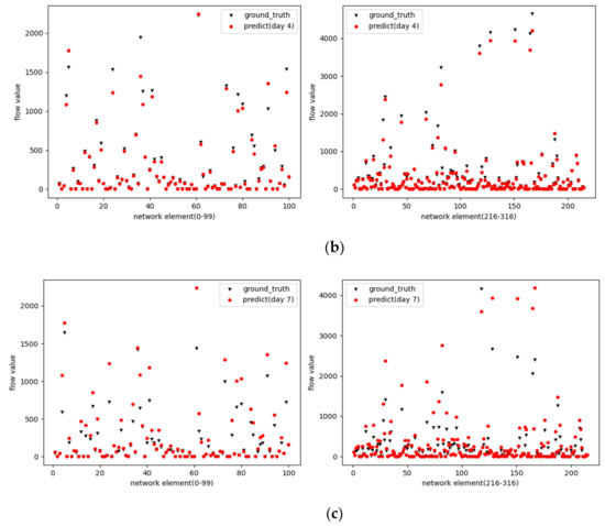 The traffic forecast results. (a) 1 day forecast results. (b) 4 days forecast results. (c) 7 days forecast results.