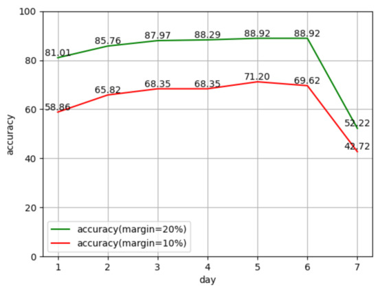This paper proposes the use of intelligent optimization algorithms to optimize data processing methods and hyperparameters in deep learning models, the use of better processed data, and combination of optimized deep learning models for data center traffic forecasting to obtain better network traffic forecasts accuracy. This experiment predicts the traffic of different time lengths such as 1 day, 4 days, and 7 days in the future, and the prediction accuracy rate is above 70%. The traffic forecast results are shown in Figure 3.