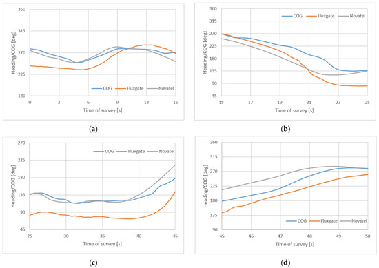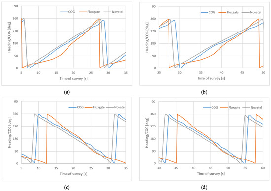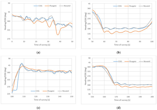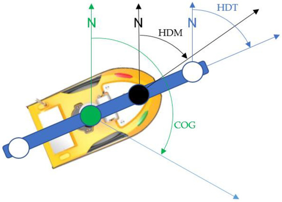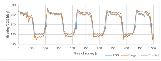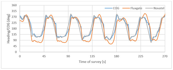 The fluxgate compass was installed approximately towards the centre line, and then, after the execution of static measurements, corrections were done in an analytic way. It is also possible to compensate it mechanically within a range of several degrees. The COG is not subject to any initial measurement nor calibration due to being a parameter determined based on the coordinates of the position. However, parameters measured by the fluxgate and satellite compasses are connected with the sounding vessel’s hull, and COG is determined on the basis of the GNSS antenna’s positions’ coordinates. There is a possible difference between COG and parameters measured by two other sensors, which can be observed in Figure 2. Generally, the hydro-meteorological conditions of wind and wave motion do not influence the measuring objects and determined parameters. The discrepancy between HDT, HDM, and COG is a result of the difference between parameters related to water and the ground.