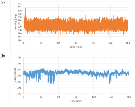 Prior to the execution of the static measurements by means of the fluxgate electronic compass, its calibration was performed by means of full circulation to the right, with a double crossing of the North direction. It was fixed into the measuring system rigidly connected with the base (a two-antenna system) of the satellite compass. The satellite compass did not require calibration. The measuring session lasted 180 min. Figure 4 shows the course plotted by the satellite compass (a) and measured by the fluxgate (b).