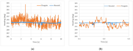 where n denotes the number of recorder headings. Because of different standard deviations, two parts of Figure 4 were presented in Figure 5: the first 10 s of static measurements (a) and a period between 5.5 and 6.5 s (b).