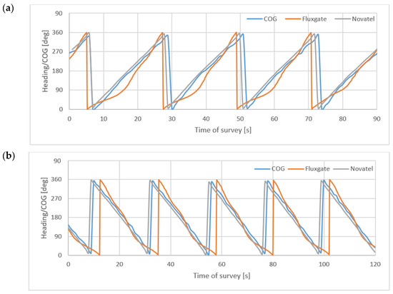 Figure 13 presents headings and COG during 90 s of rotation of the USV to the right (a) and 120 s of rotation to the left. During measurements, the USV rotated four times right and five times left.