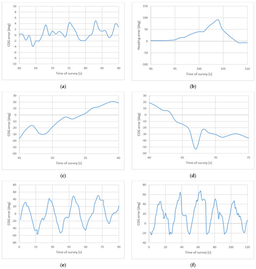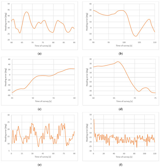 Differences between satellite compass heading and COG during surveys: long profile (a) and turning (b), short profile (c), quick heading changes (d), and circulations: right (e) and left (f).