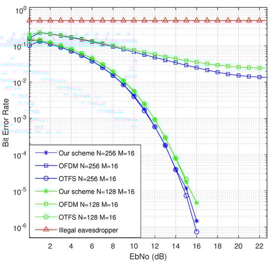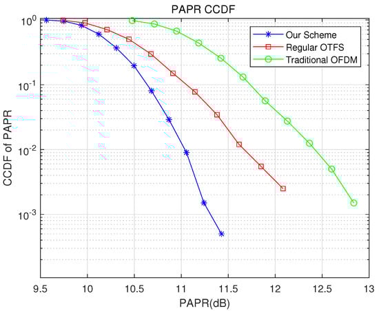 - We carry out a comprehensive simulation evaluation. Our experimental results show that our proposed transmission scheme can guarantee the underlying security property of the OTFS. Furthermore, compared to the OFDM scheme, our proposed scheme can reduce the PAPR by 20% and improve the BER by at least under the same security requirements.