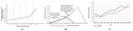 Revealing historical data of the evolution in fire detection and the relevance of response time with survival. (a) Relationship between fire death and the exposure time of fire appliances; (b) effect of a small increased exposure time; (c) day and night time dwelling fire response times [1].