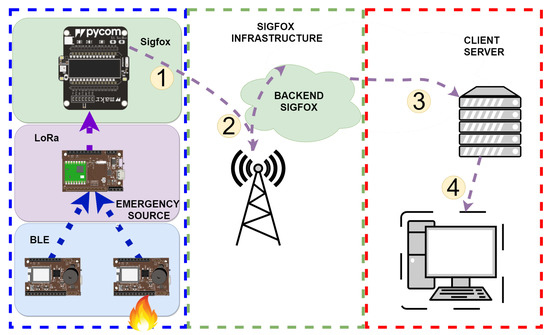 The proposed emergency system architecture can be divided into three layers at the device and communication levels. Each of these layers communicates with the next layer using a different WPAN or LPWAN technology. Figure 2 shows a global diagram and all components involved in communication from the emergency point to the destination. In Step 1, communication occurs through the global structure of the physical architecture. In Step 2, the alarm is transmitted through the structure of the service provided by Sigfox. In Step 3, the alarm is processed in the client’s alarm processing and storage structure. Finally, in Step 4, the alarm is displayed at the destination warning system in the emergency center.