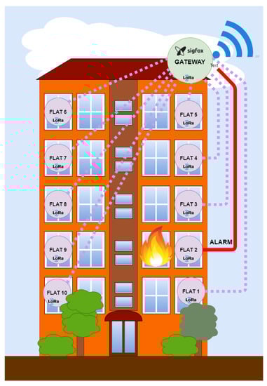At the next level, the network is configured by an LPWAN network based on LoRa RAW. This level is configured in a star topology since the gateways of the building located in each house are connected to a single Sigfox gateway. The coverage of LoRa devices in the open field is very wide, but when they are indoors, their signal is attenuated by the natural obstacles of the building. Therefore, when LoRa devices are installed, an assessment of attenuation needs to be performed in order to get enough signal level in the devices to achieve the desired performance in the system. Ideally, the installation of these devices is located near windows, terraces, or courtyards to avoid the attenuation of the LoRa signal. For instance, in tests carried out with a transmission power of 14 dBm and an antenna with a gain of 2 dBi, a successful transmission between gateways was achieved, bypassing five floors of a building.