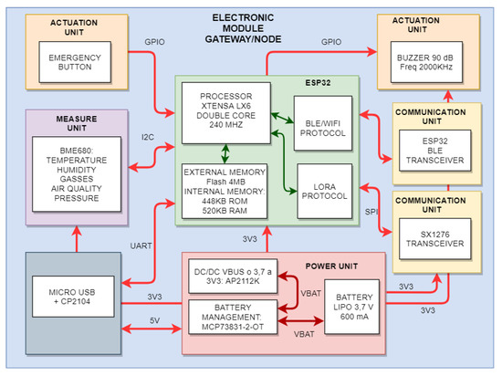 Figure 6 shows the diagram block proposed for the node/gateway hardware prototype. Each block or set is responsible for each of the main functions that a node must contain. These main functions are the power supply, the sensor or measurement unit, the processing unit made by the ESP32 microcontroller, the communication system, made by the transceiver included in the processing unit, and an external transceiver for communication by LoRa when the device works as a gateway. An actuation block is also included, consisting of an emergency button that activates an alarm and a buzzer that notifies the user upon detection of an emergency.