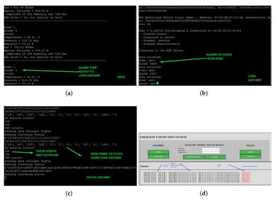 Figure 8. Process of the firmware working on diverse devices of the system. (a) Node/sensor idle status. (b) LoRa gateway receiving an alarm from the BLE subnet. (c) Sigfox gateway receiving a dataframe through LoRa RAW. (d) Emergency center/client website.
