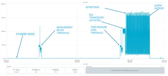 Figure 9, Figure 10 and Figure 11 show the consumption results obtained with the different sensor prototypes used to measure the temperature parameter. Figure 9 plots the entire measurement process: the activation of transceivers, advertising and sending of alarm to the gateway, and the consumption of each process. This entire process was performed with the ESP32-based prototype.