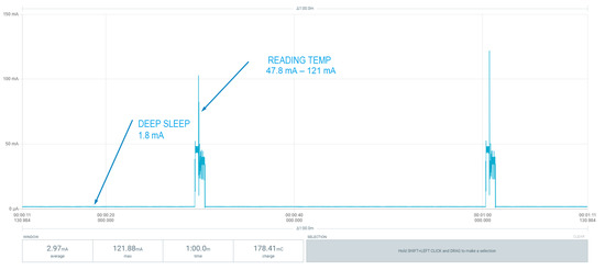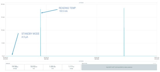 Figure 10 and Figure 11 present the comparison of consumption at the most critical step of the node: the measurement of temperature and sleep state. Both states will be the processes in which the node will normally be and, therefore, will most need to be monitored when predicting the autonomy of the system.