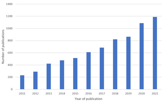 After excluding unrelated topics such as economics, psychology, etc., a total of 7187 documents were collected. The chart in Figure 1 shows the total increase in published papers by year, while Figure 2 shows the major publishers.