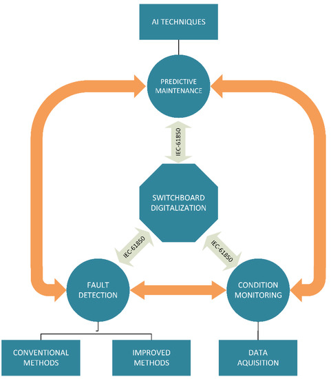 In the above figure, the orange arrows depict the bidirectional flow of information, and condition monitoring is utilized in the following scheme for data acquisition that is further processed for use with the purpose of fault detection or predictive maintenance. Conversely, the results of the analysis of predictive maintenance or the detection of faults can improve the equipment monitoring by providing data as to optimize the location of sensors or add/remove different types of sensors. In the following subsections, the various applications in each category will be exemplified, but due to significant interconnection they are not always easy to differentiate.