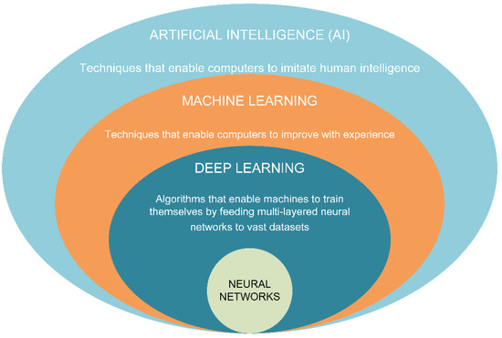 Considering that predictive maintenance leverages operational data (a collection of various operational parameters over an extended period of time) captured through real time condition monitoring (if implemented) and provides a significant amount of data, the need to automate the recognition, classification, and prediction of potential failures/anomalies is obvious. Until recently, the classification and detection of failures, degradation, or defects have been conducted manually, which had the disadvantage of depending on the expertise of staff. More recent trends use artificial intelligence (AI) algorithms to automate all or part of the data analysis process. In the literature, the terms AI, neural networks, machine learning, and deep learning are often used interchangeably, giving the impression that they are not easily distinguishable. In short, machine learning is a subset of AI, while deep learning is a subset of machine learning, with neural networks being the basis of deep learning, which is distinguished by the number of node layers (also called depth), where a deep learning algorithm must have more than three; the subdivision is shown in Figure 5.