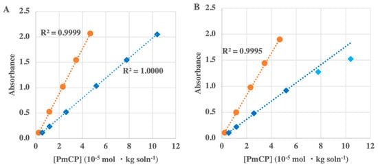 Absorbance linearity is important because it is an indication of absorbance accuracy, which affects pH accuracy. To test the linearity of the instrument, the absorbance of different concentrations of stock solutions of purified mCP (PmCP) in the singly-protonated (HL−) and deprotonated (L2−) forms were measured at 434 nm and 578 nm, respectively. A pH ~5 sodium acetate buffer and a pH ~11 NaOH solution were used to isolate the singly-protonated and deprotonated forms of the dye, respectively. Reagent stock solutions were diluted to achieve mCP concentrations ranging from 2.4 × 10−6 to 4.7 × 10−5 mol·kg soln−1 at pH 11 and 5.5 × 10−6 to 1.1 × 10−4 mol·kg soln−1 at pH 5, varying the absorbance from ~0.1 to 2 absorbance units. All solutions were adjusted to salinity 35 using NaCl. Measurements were completed in triplicate over the range of concentrations for all solutions.
