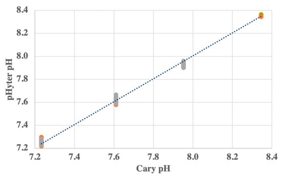The pHyter’s accuracy and precision were further evaluated over a range of pH values through measurements by three pHyters and an ultraviolet-visible (UV-Vis) dual beam spectrophotometer (Varian Cary 100, referred to as the Cary spectrophotometer). Filtered seawater collected from the Pacific Northwest was amended with 0.1 N NaOH or 0.1 N HCl (certified standards, Fisher Scientific, Fair Lawn, NJ, USA) to obtain analyte solutions with varied pH. Eight measurements across four pH values (~7.25, 7.6, 7.9, and 8.3) were made using each pHyter and the Cary spectrophotometer. For measurements on the Cary spectrophotometer, a 10-cm cuvette was used to minimize the perturbation of seawater pH by the addition of PmCP []. The temperature of the cell was controlled using a water-jacketed cell holder, and samples were allowed to equilibrate to temperature for 10 min prior to blank measurements at 434 nm, 578 nm, and 740 nm (740 nm was used as a reference for light source drift since the indicators do not absorb light at this wavelength). Each pH analysis included three 80-µL additions of dye. After each addition, the dye was mixed with a micromagnetic stir bar, and absorbances at the three wavelengths were measured. pH was calculated using Equations (2)–(7). For these comparisons between the pHyter and the Cary spectrophotometer, the pH of the solution (pHT) was reported as the pH at zero dye concentration, which was extrapolated from the three dye additions [,].