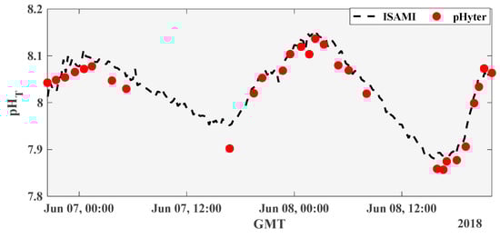 To verify the pHyter accuracy and precision for environmental pH measurements, the pHyter was compared to an in situ instrument, the iSAMI-pH (Sunburst Sensors, LLC, Missoula, MT, USA). The accuracy of the iSAMI-pH was verified at Sunburst to be better than ± 0.006 on Tris buffer at 25 °C and salinity 35 []. Measurements were made in a back reef environment in Tetiaroa, French Polynesia, in June of 2018. The iSAMI-pH was deployed for 36 h and collected pH measurements every 15 min. Measurements with the pHyter were taken in triplicate at regular intervals near the inlet of the iSAMI.