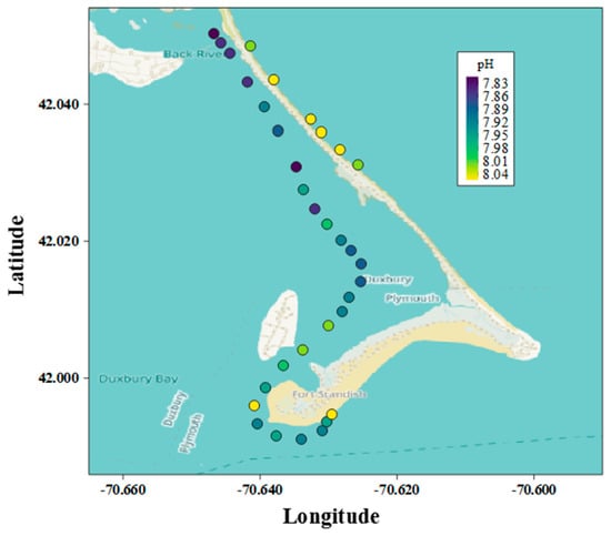 The pHyter measurements highlight the localized pH differences. Inside the bay, the pH increased along the transect from lower pH inland to higher pH towards the southern tip and open ocean (Figure 5). On the open-ocean side, the pH was consistent across the transect and higher than within the bay. Across this small distance (<5 miles) pH varied by nearly 0.2 pH units, which is a significant amount for many organisms (e.g., CaCO3 saturation) and biogeochemical processes [,,]. Although some of this variation might be due to temporal and/or temperature differences (±1.9 °C) in the samples and pH change resulting from the natural diel cycle (the time difference between the first sample and the last sample was ~4 h, beginning at around 7:00 a.m.), the short time span of the study, as well as the trend of stable pH at the open-ocean sites, indicates that the difference is likely dominated by location. This pH range is also larger than the largest standard deviation of the laboratory seawater measurements completed by the pHyter (±0.026 at pH 7.61), validating the ability of the pHyter to resolve the pH differences within a coastal environment.