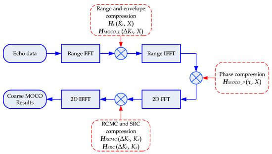 From Equations (17)–(25), we derived the detailed analytical expression of residual RCM which is related to the range-variant motion error, and designed a series of compensation functions to deal with range-variant motion error and residual RCM. We now use these compensation functions to construct the one-step MOCO operator in . We first derive matrix M. Define range FT and IFT operators as and , respectively. Define two-dimensional FT and IFT operators as and , respectively. Then, according to Figure 2, matrix M can be written as: