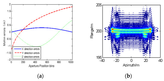 We first conduct point target simulations to demonstrate the effectiveness of the proposed SAR imaging method. The parameters of the simulated SAR system and two point target coordinates are shown in Table 1. The echo data were generated in time domain by exact slant range mixed with motion errors extracted from a real−measured airborne INS. The detailed motion errors are shown in Figure 4a.