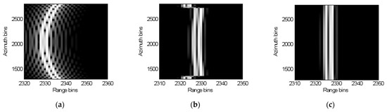 Figure 5 presents the RCMC result of the proposed one-step MOCO method. It can be seen in Figure 5b that the residual RCM after the conventional RCMC process exceeds multiple range bins, which will certainly cause a big reconstruction error in sparse regularization SAR imaging. It is shown in Figure 5c that all the residual RCM of points 1 and 2 are well-removed after using the proposed one-step MOCO method, which also indicates that the majority of the motion errors are removed.