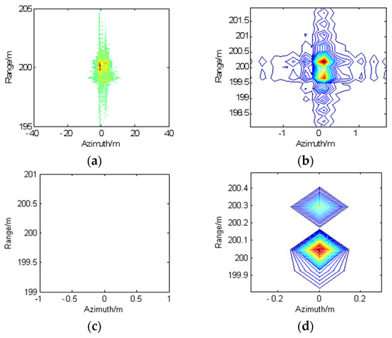 Point targets imaging results, (a) CSA with PGA applied; (b) CSA with proposed one-step MOCO method; (c) imaging method in [20]; (d): proposed imaging method.