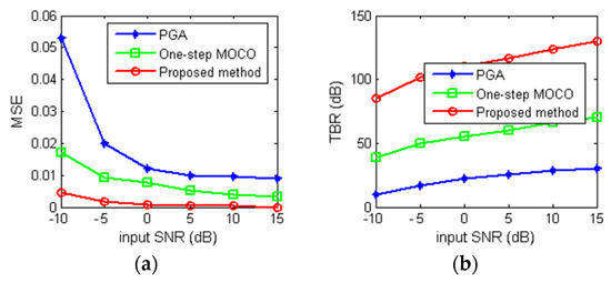 We then present the quantitative evaluation of the reconstruction results for various input SNRs, as shown in Figure 6. Since the method in [19] fails to reconstruct points 1 and 2, we choose CSA with the proposed one-step MOCO method (written as one-step MOCO method in Figure 7 as well as PGA as comparison methods). We conducted the experiments 20 times to obtain the points on the curves. Figure 7a shows the mean square error (MSE) between the reconstruction image without motion error and the imaging results from different imaging methods. Figure 7b shows the comparison results of target-to-background ratio (TBR), which is used to determine the accentuation of the target pixels with respect to the background. From Figure 7, it is clearly noticeable that the proposed method performs better than the PGA and one-step MOCO method. It also can be seen that the proposed method can provide a very accurate reconstruction of the original scene when SNR is low, which demonstrate the robustness of the proposed method.
