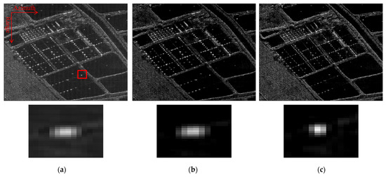 Figure 8 shows the final imaging results of scene A using the PGA method in [19] and the proposed method, respectively. We also put the zoomed-in images containing a dominant point marked with a red square below the imaging result. It can be clearly seen that the proposed method obtained the best image focusing quality. It is noted that in Figure 8b, there is a shift of point target location in the red square window, i.e., the dominate point is not at the same coordinate values compared with Figure 8a,b. Since our main purpose in Figure 8 is to compare the image focusing quality, we adjust the point target to the image center. This phenomenon shows that the motion errors in scene A not only generate azimuth-varying phase errors but also generate other envelope terms and phase errors.