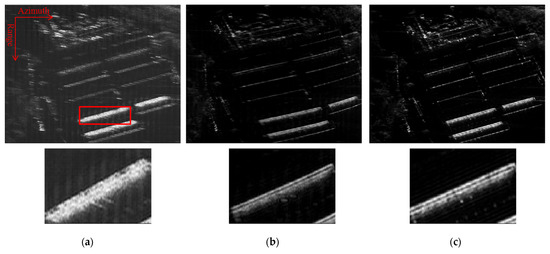 Furthermore, we use another echo dataset to test the effectiveness of the proposed method, where the exact motion information cannot be exploited for MOCO. The data are collected by an X-band airborne SAR system; the platform speed is about 200 m/s and the radar height is about 11,000 m. We name this scene as scene B and discretize it into 1024 × 1024 when using the sparse imaging method. Figure 9 shows the final imaging results. It can be seen that the imaging result using PGA is defocused, and there exists severe deformation in the reconstructed image using the method in [20]. This is because both comparison methods cannot compensate large range-variant motion errors. Figure 9c shows the reconstruction result using the proposed method. It can be seen that the whole image is well-focused. To give a close insight of the reconstruction result, we also show the zoomed-in images containing man-made buildings marked with a red rectangle. It can be seen that the proposed method can give a much clearer visual effect than the competing methods, where the edge of the building is clear and sharp.