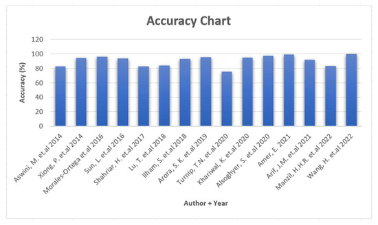 Almost all primary studies which were analyzed for this SLR use accuracy as one common metric to assess the proposed methodology. Several studies showed over 90% accuracy during the evaluation phase. However, at the same time, it was mentioned in the studies that there is a high chance of FP and FN due to various factors. These factors are methodology-specific and discussed in each paper specifically. Some of the studies use other metrics as well, such as F1 Score and AUC (area under curve), but for the sake of a unified answer to this RQ, we would consider accuracy as the assessment metric. Figure 7 shows the accuracy chart for primary studies (except [22], where accuracy was not reported).