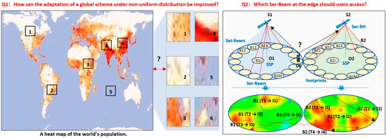 Figure 1 shows the problems of load balancing for Ser-BH in SIN. As Figure 1 shows, the first problem is how to improve the local scheme for load balancing of adjacent Ser-Beams to adapt to global scenarios. For large degradation of signal fading, the load balancing between adjacent Ser-Beams around the edge of Sat-Beams should be paid more attention to. However, there are thousands of possible scenarios for adjacent Ser-Beams with different DoU. The optimal scheme is not only to solve the problem in the case of local load balancing, but also different local scenarios around the world. The second problem is which Ser-Beams the users should be accessing to under the DoU of spatiotemporal non-uniform. The SSPs of an observed satellite are not permanent and not in the center of F-Ser-Beams, which are different from other satellites and have different times. The trajectories of SSPs are also different in the Ser-Beams serving during (SD). That means the probability density of power (PDP) of the satellite signal at the same position on the ground would vary with time, and the corresponding capacity of each Ser-Beam would also change.