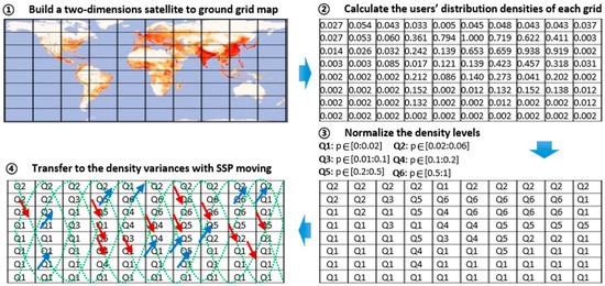 Existing research on load balancing schemes for satellite networks focuses on Sat-Beam scenarios without intra-Ser-BH, and users with unified uniform distribution in the time and space domains [8,9,10,11,12,13,14,15]. Optimization of satellite network routes is the prevailing design for achieving load balancing in this research. However, the DoU are spatio-temporal non-uniform; none of the research can solve the problems of global load balancing based on local balancing schemes and the selection of access to Ser-Beams under changeable DoU. Considering the DoU have a serious relationship with geography, the users of S-IoT-N can be divided into different grids on the surface of the earth. After combining the grids with global population distributions, we can obtain multi-grids with different DoU densities. We can operate the load balancing according to the density variances of users under different movement directions from one grid to another grid. Though the densities of grids are different around the world, all scenarios can be taken as a limited set for density variances of users. Then, the basic load balancing schemes become the original reference for global schemes and different times, which can be taken as the gene of the genetic algorithm (GA). After modeling and improving the mutation and crossover of the gene, it can effectively solve the problem of the adaptation from a local balancing scheme to global balancing and the selection of Ser-Beams to access.
