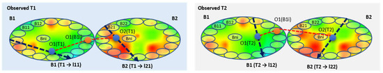 In Equation (3), the PDF variances of different grids changing around the SGGM can be described by to provide a foundation for solving the problems of global load balancing adaption. Here, the problems should be further analyzed in depth. In actual S-IoT-N scenarios, users are not distributed uniformly in different grids, especially for non-centered SSPs. As shown in Figure 4, two adjacent F-Sat-Beams and were observed. can be further divided into several F-Ser-Beams ; can be further divided into several F-Ser-Beams . The Ser-Beams around the edge of and are of most concern. The serving periods of different satellites in the satellite constellation serving on the same F-sat-Beam are different, which have different start-serving-times and over-serving-times . Figure 4 shows the trajectories of the SSPs in F-Ser-Beams and at the periods of and , which are set as and . Next, in the period , the center-point of is closer to the SSP trajectory of than SSP trajectory of . In the period , the center-point of is closer to the SSP trajectory of than the SSP trajectory of . Considering that the distances between the center-points of Ser-Beams and satellites are similar, the SSPs in the two Ser-Beams are similar too. Therefore, the problem of load balancing lies in determining which satellite’s Ser-Beams users should access, and not the access threshold. Following this problem, it can be analyzed that the constraints of optimal load balancing relate to the density variances of DoU with the SSP movement, the number of users with different services, and the differences in DoU of adjacent F-Ser-Beams.