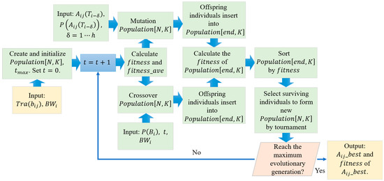 Under the above optimization direction, we have the solutions , which are the initial populations of GA optimization. The offspring individuals generated by the crossover mutation in each generation and the parent individuals form a new group and individuals are selected using the tournament method to form the next generation populations. The new populations participate in the evolution of the next generation.