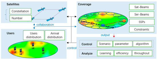 To verify the performance of the proposed scheme, we constructed a platform to simulate the load balancing of S-IoT-N. This platform consisted of four modules: the satellite simulation module, user simulation module, coverage simulation module, and control and analysis module, as per Figure 7. The satellite simulation module was mainly used to simulate satellite nodes under different satellite configurations, which affected the size of satellite signal coverage on the ground, as well as the SSPs. The user simulation module was mainly used to simulate different DoU, which related to the population distribution and service behavior. The coverage simulation module mainly simulates F-Sat-Beams, F-Ser-Beams, the trajectory of SSPs on the ground, and the constraint boundary corresponding to the population distribution and determined constellation. The control and analysis module was mainly used to complete scenario realization, parameter configuration, and algorithm selection, as well as analysis of the learning ability of the algorithm, the throughput, and the efficiency of the traffic balancing method.