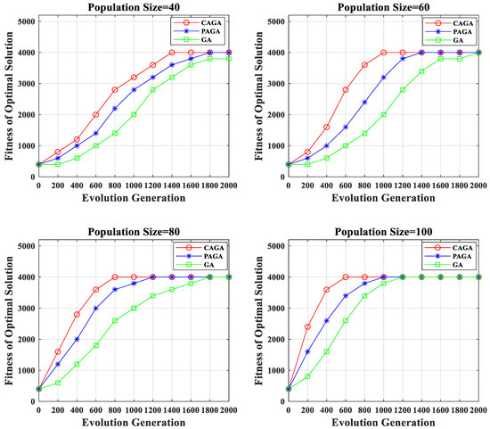 It can be seen from the statistical chart that under the condition of different population sizes in Figure 8, CAGA has higher optimization solution efficiency. The reason for this is that CAGA exploited prior information to limit the convergence direction of the algorithm, which accelerated the convergence speed of GA. The PAGA and traditional GA only choose better solutions in the selection module. However, the CAGA chose better solutions in the selection module, crossover module, and mutation module, which make the CAGA more efficient. Taking a population size of 60 as an example, the CAGA figured out the global optimal solution in the 1000th generation, which is 400 generations less than the probability adaptive genetic algorithm (PAGA), and nearly 1000 generations less than the traditional GA. Under the conditions of four different population sizes, the average generation used by the CAGA to search for the optimal solution is 400 generations less than that of the PAGA on average, and 700 generations less than that of the traditional GA.