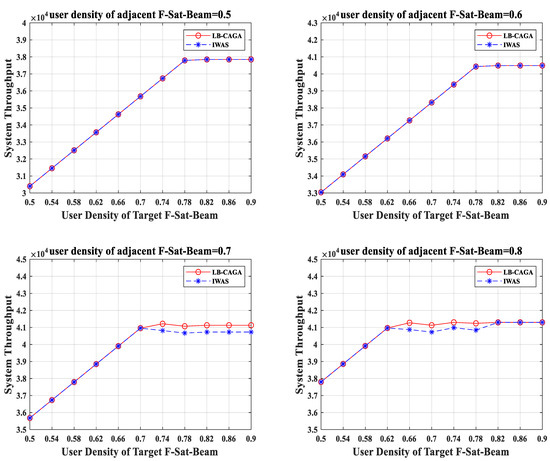 As we can see from Figure 9, the system throughput of LB-CAGA and IWAS is consistent when the user density of the adjacent F-Sat-Beam is 0.5 and 0.6. When the user density of the adjacent F-Sat-Beam is 0.7, and the user density of the target F-Sat-Beam is less than 0.74, the system throughput of LB-CAGA and IWAS is consistent. When the user density of the adjacent F-Sat-Beam is 0.7, and the user density of the target F-Sat-Beam is more than 0.74, the system throughput of LB-CAGA is on average 0.4G higher than that of IWAS. When the user density of the adjacent F-Sat-Beam is 0.8, and the user density of the target F-Sat-Beam is less than 0.62, The system throughput of LB-CAGA and IWAS is consistent. When the user density of the adjacent F-Sat-Beam is 0.8, and the user density of the target F-Sat-Beam is greater than 0.62 and less than 0.82, the system throughput of LB-CAGA is on average 0.4G higher than that of IWAS. When the user density of the adjacent F-Sat-Beam is 0.8, and the user density of the target F-Sat-Beam is more than 0.82, the system throughput of LB-CAGA and IWAS is consistent.