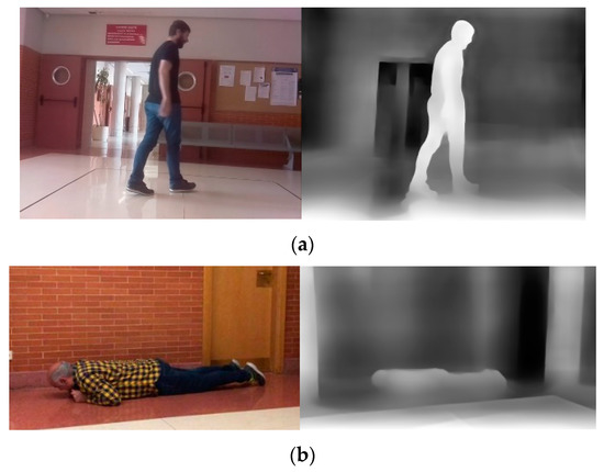 Comparison of RGB and depth images: (a) non-fallen and (b) fallen (left: RGB images, right: depth images). Images from the Fallen People Dataset (FPDS) [8].