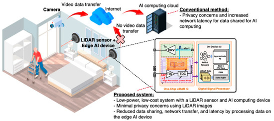 We realized an indoor-monitoring LiDAR sensor that provides a potentially low-cost, low-power solution for detecting the falls of patients with Alzheimer disease. It consists of an efficient optoelectronic AFE circuit with an on-chip P+/N-well APD to alleviate the complicated integration issue of an optical device and a 2D-modified Vernier TDC to generate 4-bit binary codes for range detection. To the best of the authors’ knowledge, this is the first attempt to integrate all analog components, including an input optical device, for indoor-monitoring LiDAR sensors. Moreover, a low-latency neural processor is used for image processing. We demonstrated that the proposed system can obtain privacy-preserving depth images of patients and classify them locally without sending them to a server. The proposed neural processing is lightweight enough to be implemented on low-cost processors, yet it is fast enough to perform classification in real time. For practical deployment, it would be important to install the system so that it can cover as much space as possible, excluding space that can potentially cause misclassification, such as beds and sofas. As future work, the proposed system will be further improved to distinguish various situations, such as sleep and cases of falls, non-falls, and falling down, through context awareness.