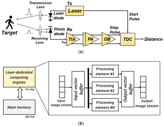 Figure 3a depicts a block diagram of the proposed indoor-monitoring LiDAR sensor, in which the reflected light pulses are detected by an optical detector (typically an avalanche photodiode or APD) in the receiver. Then, the corresponding photocurrents are generated from the APD, converted to voltage signals, and amplified by an analog front-end (AFE) circuit that comprises a transimpedance amplifier (TIA) and a post-amplifier (PA). Thereafter, a time-to-digital converter (TDC) estimates the distance to targets by measuring the time interval between the emitted pulse and the reflected one.