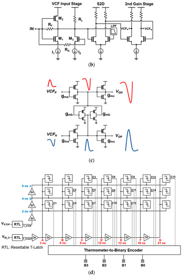 Figure 4d shows a block diagram of a two-dimensional (2D)-modified Vernier TDC, which converts a narrow pulse to a wide digital signal using a resettable T-latch [12].