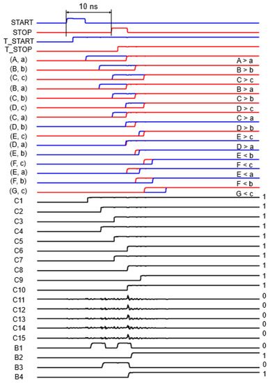Therefore, this 2D-modified Vernier TDC enables alleviation of the timing walk error by steepening up both rising edges of the START and STOP signals. Both the START and STOP signals of the resettable T-latch are delayed by each inverter chain. The T_START signal is delayed by 3 ns, while the T_STOP signal is delayed by 2 ns at each delay line. Hence, the timing resolution of the 2D-modified Vernier TDC can be 1 ns. In this work, the maximum time interval is designed to be 15 ns, with six START delay lines and three STOP delay lines. Correspondingly, this 15 ns time interval is translated to the maximum detection distance of 4.5 m. Meanwhile, timing comparators are implemented using S-R latches, which determine whether the START signal is ahead of the STOP signal at each point in the Vernier plane. Figure 5 depicts an example of the simulated waveforms of the 2D-modified Vernier TDC with a time interval of 10 ns. It can be clearly seen that it generates 15-bit code of 000001111111111, which is converted to 4-bit binary code 1010 via a thermometer-to-binary encoder.