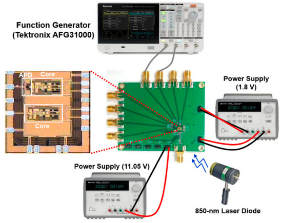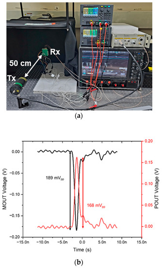 Figure 8a shows the test setup for the optical measurements, in which the proposed LiDAR AFE IC is located on a printed circuit (PC) board with 50 Ω terminations, and an 850 nm laser diode generates 1 ns light pulses at an 80 MHz repetition rate with a 10 mW average power. The distance between the PC board and the laser diode is set to 50 cm.