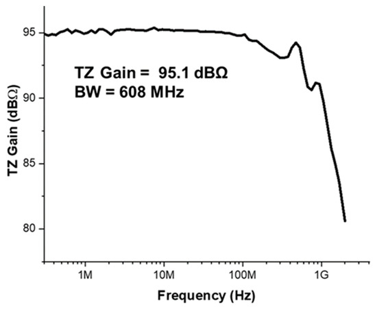 Figure 7 demonstrates the measured frequency response of the proposed LiDAR AFE IC, where a single-ended transimpedance gain (Z21) of 95.1 dBΩ and a bandwidth of 608 MHz are measured.
