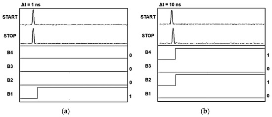 Meanwhile, the TDC core occupies an area of 840 × 270 μm2 and consumes 20.9 mW from a single 1.8 V supply. Figure 9 demonstrates the measured TDC outputs of the LiDAR AFE IC at (a) 1 ns and (b) 10 ns time intervals. It can be clearly seen that the 4-bit binary code indicates the delay time between the START and STOP signals.