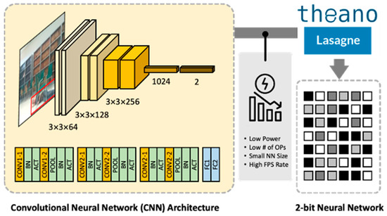 Because of the low-precision computation, computation can be significantly reduced compared to the existing IEEE 754 floating point format, thereby increasing the frames per second (FPS) and energy consumption per frame, which are important for targeted edge devices. The structure of the CNN in our work is based on [10], and it is composed of multiple convolution layers, batch normalization layers, connected layers, activation layers, and pooling layers, as shown in Figure 10.
