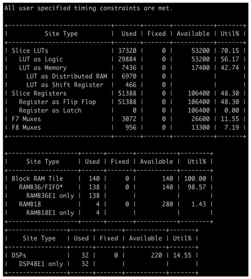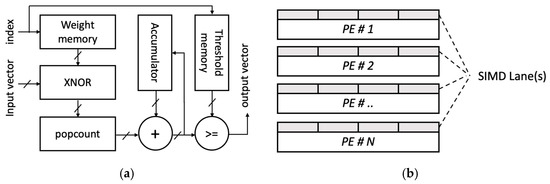 As shown in Figure 11, the hardware consists of the Matrix–Vector–Threshold Unit (MVTU) and SIMD structures, where MVTU, a processing element (PE), is the basic unit of operation. The structure of the hardware generated in this task can adjust the throughput of each layer engine by configuring the number of PE and SIMD lanes in the MVTU. The amount of computational logic and the number of SIMD lanes are determined under the constrains of the FPGA used.