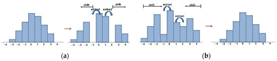 There are many PEH-based RDH techniques [8,9,10] and the differences between these algorithms mainly focus on two aspects, which are PEH generation and the PEH modification. For PEH generation, researchers have published various prediction schemes to improve the prediction accuracy and thus generate a more concentrated histogram; for PEH modification, researchers have also proposed many PEH shifting methods to enhance the data embedding rate of confidential images and reduce the expansion distortion. In this paper, we use a commonly applied histogram shifting method to modify PEH. After obtaining the predicted pixel value , we use Equation (5) to calculate the prediction error and embed the confidential message into the predicted values using the rules given in Equation (6). The corresponding process is illustrated in Figure 1a, where bins 0 and −1 are merged back to bin 0; bins 1 and 2 are merged back to 1; and secret bits are extracted during the process: