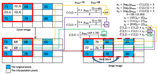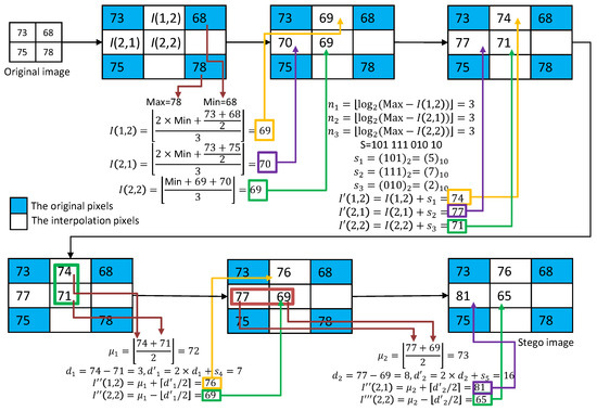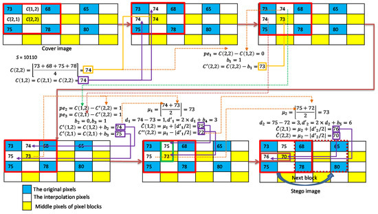 As shown in Figure 7, we give an example to illustrate the BM interpolation and two-layer embedding strategy for smooth pixel blocks. The seed pixels are 73, 68, 75, and 78; and the secret data stream is assumed to be ‘10,110′. We first use the block mean as the interpolated pixel values . Then, the proposed O-PEH is applied first. The secret data is embedded to and it results in . The next two secret bits and are then embedded to and , and the resulting pixel values are and . In the second embedding layer, we first use and as a group for DE embedding and embed secret data , and and are obtained. Finally, and are used as a group for DE embedding and to embed secret data , and and are obtained.